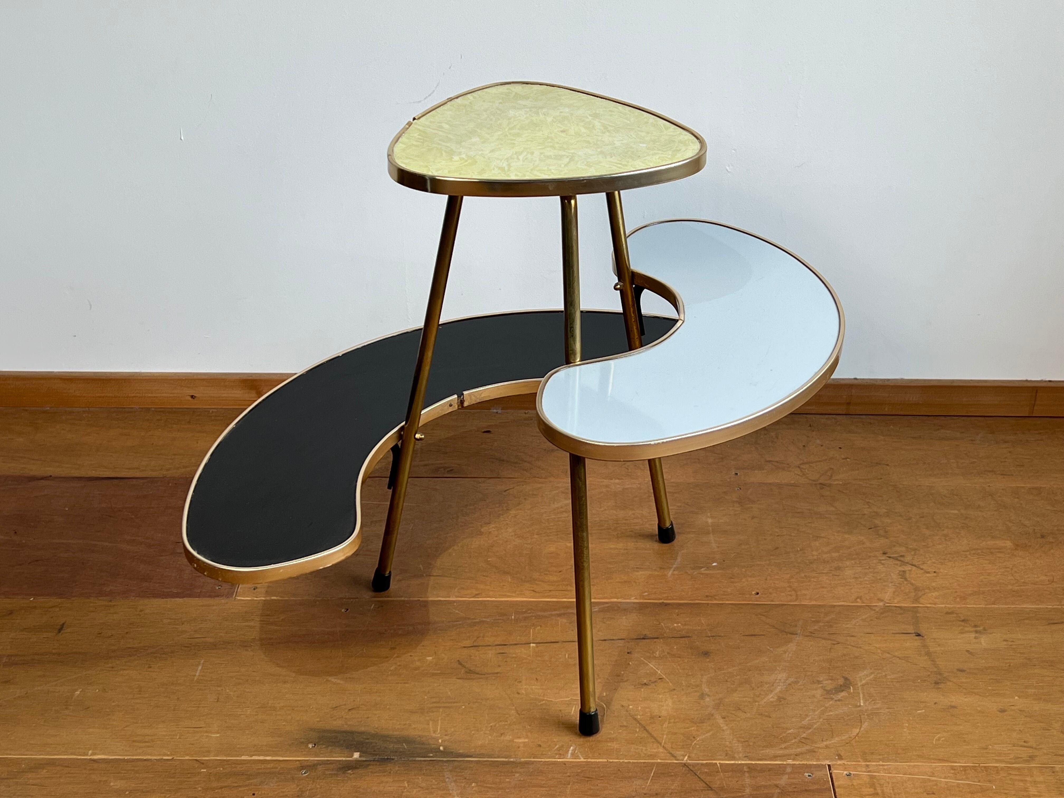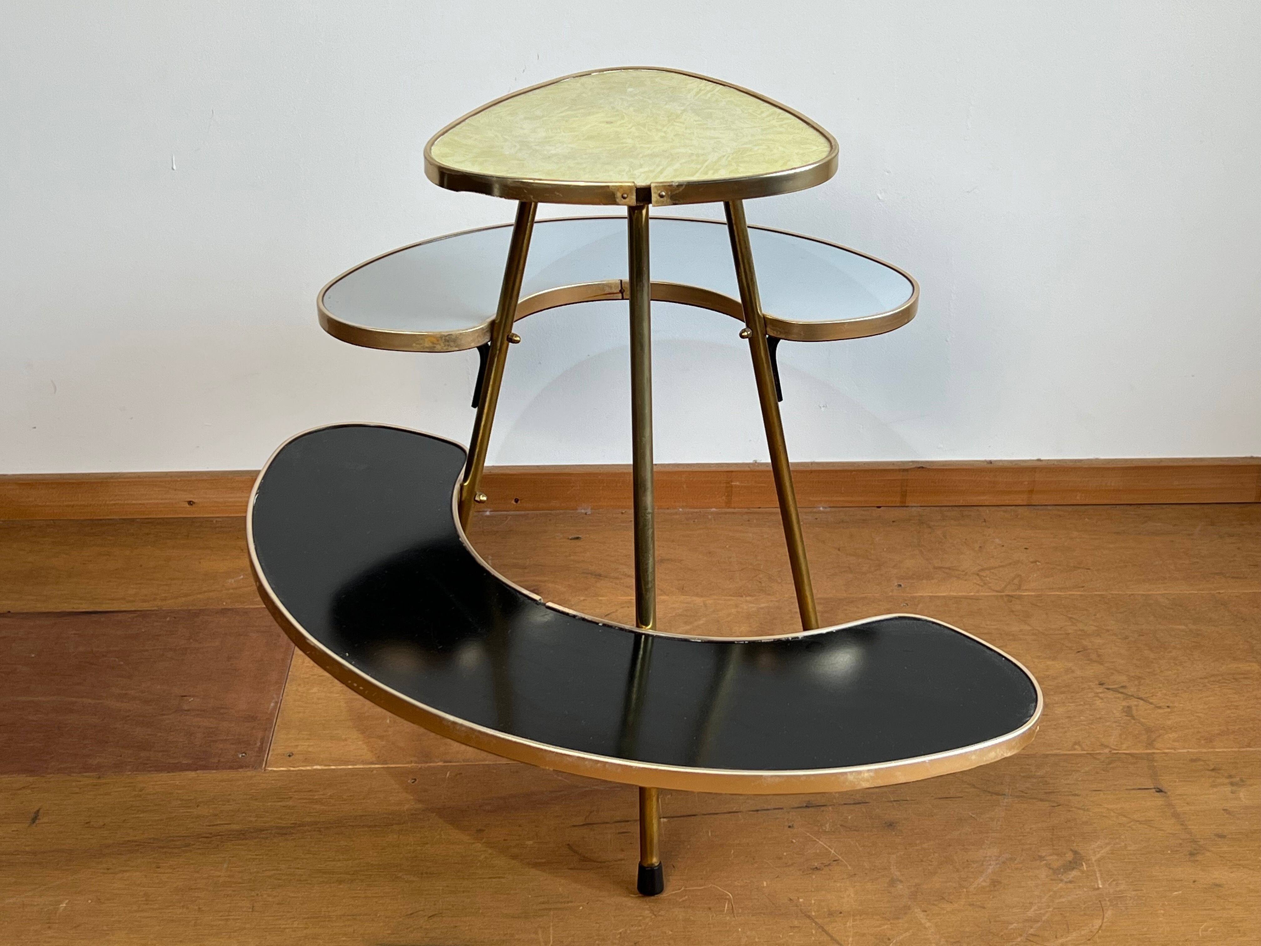 50~60年代頃のトライポッドプラントスタンド ・サイドテーブルとして用いられた当時のアトミックエイジの象徴的なパレット型フォルムのデコラトップ×3ステージ。US影響を受けたヨーロッパのビンテージ品になります。