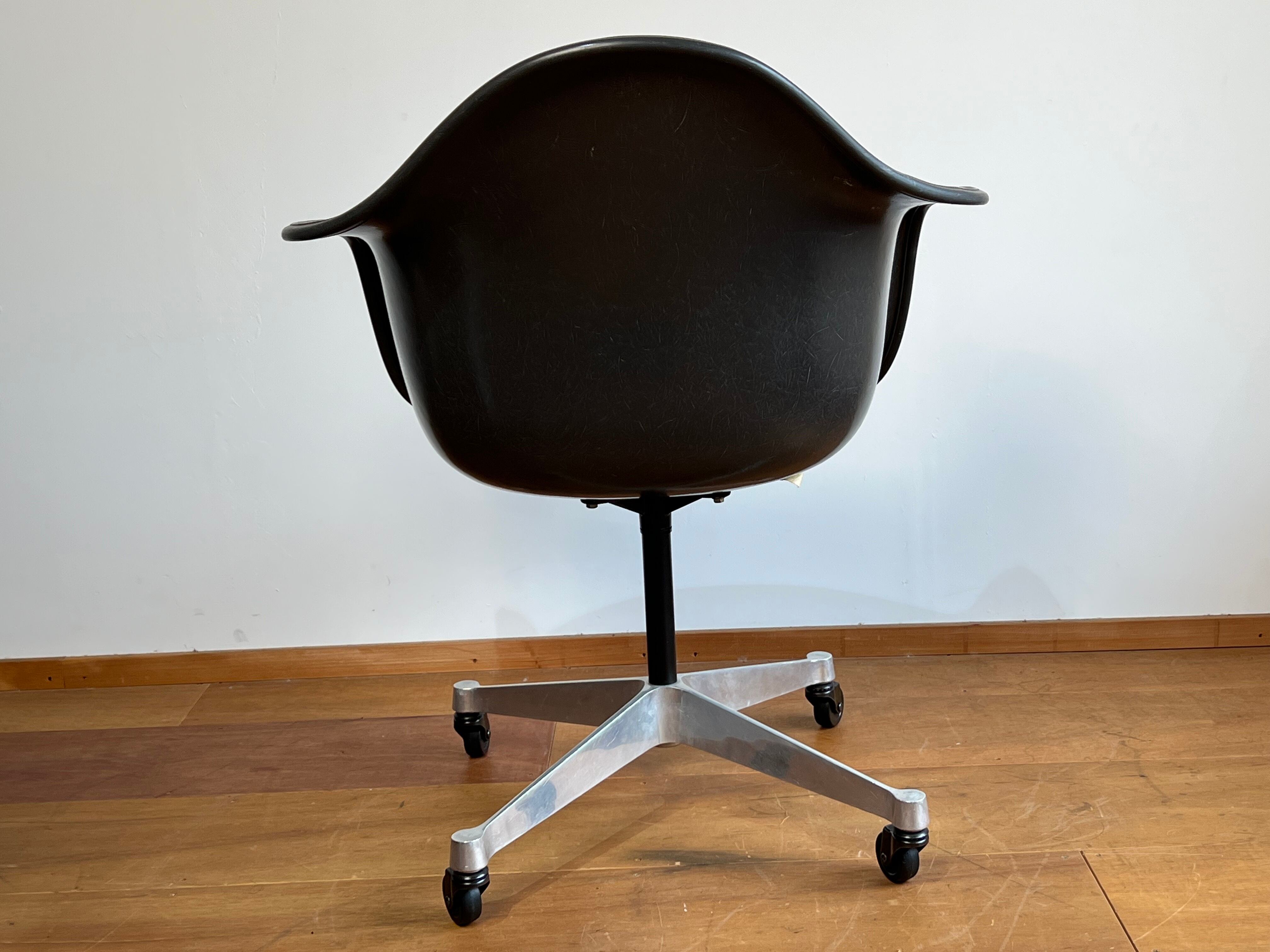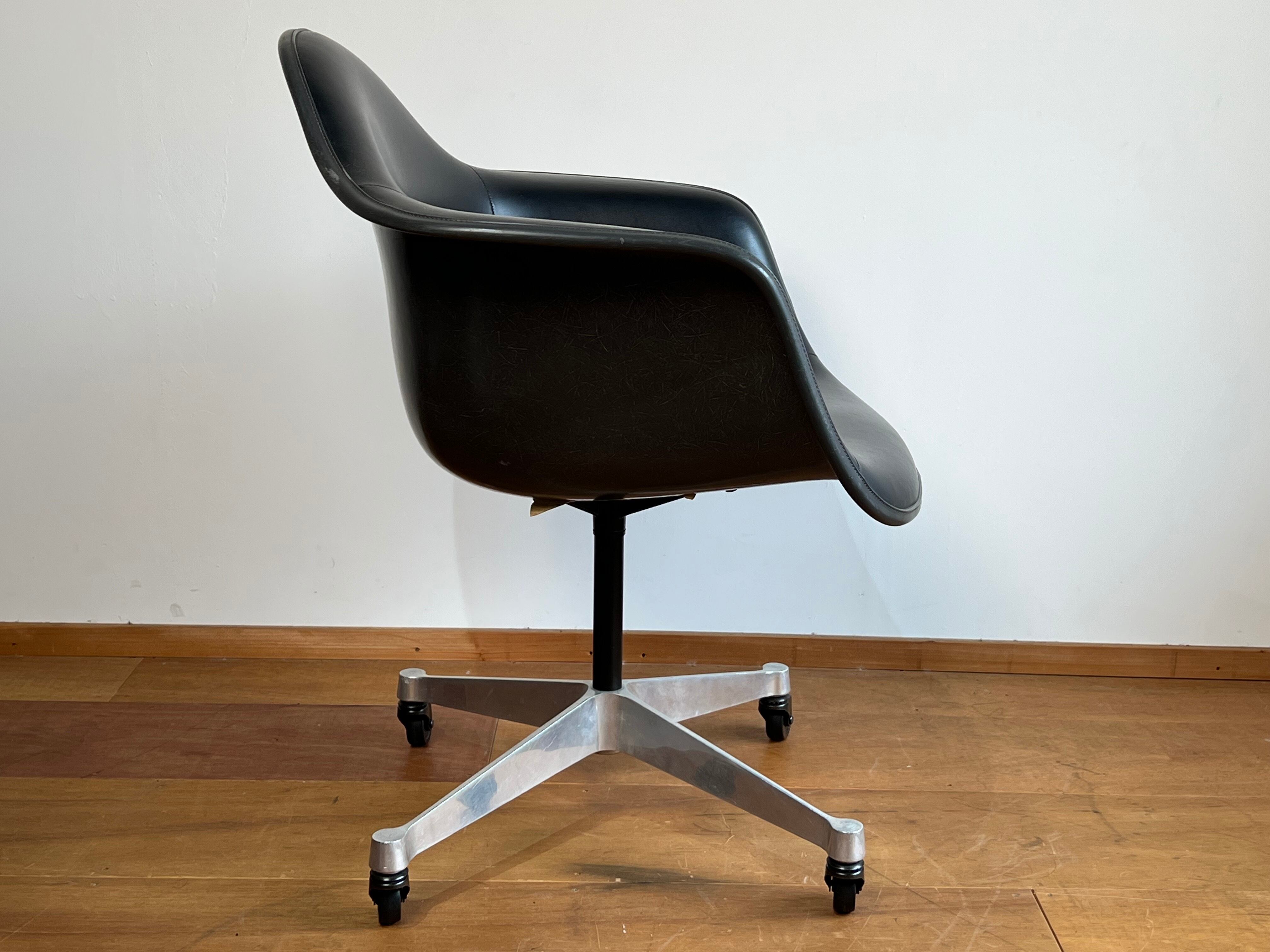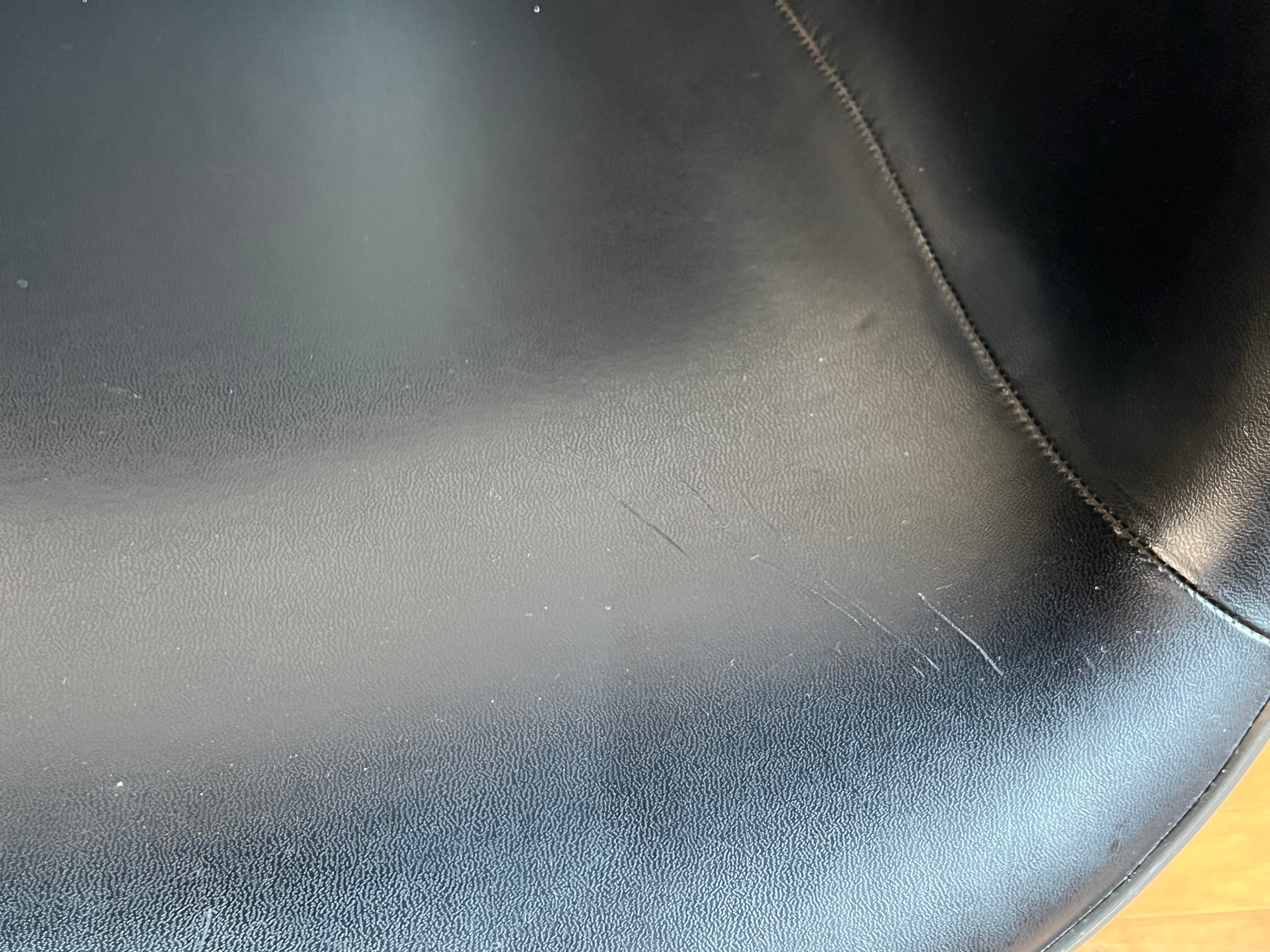 ビンテージのブラックシェルにブラックのナウガハイドレザーが張り込まれており、ビンテージシェルチェア用のキャスターベースの組合せという贅沢な仕様になっています。